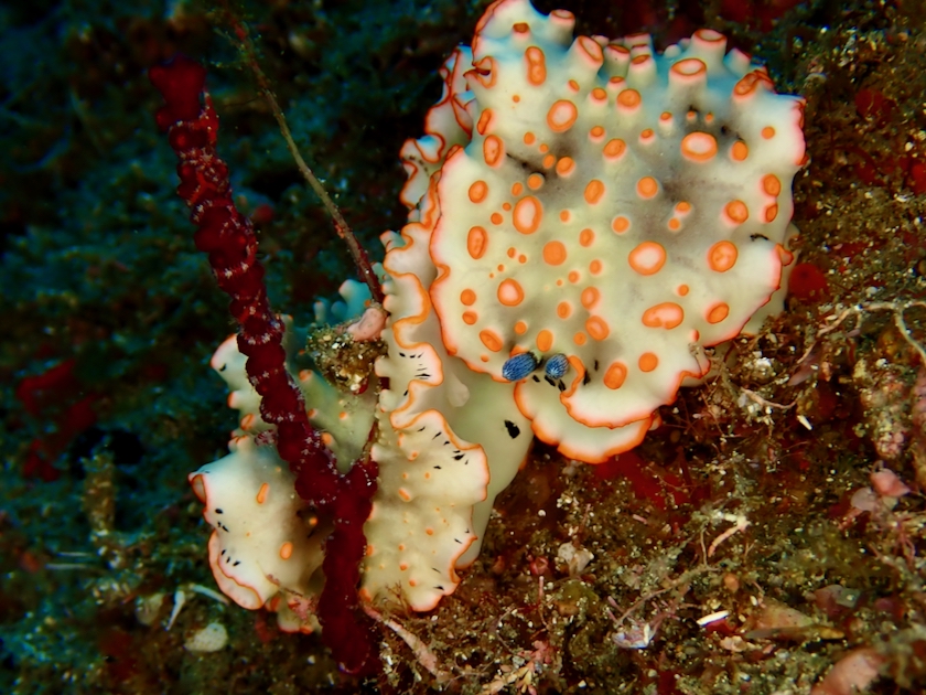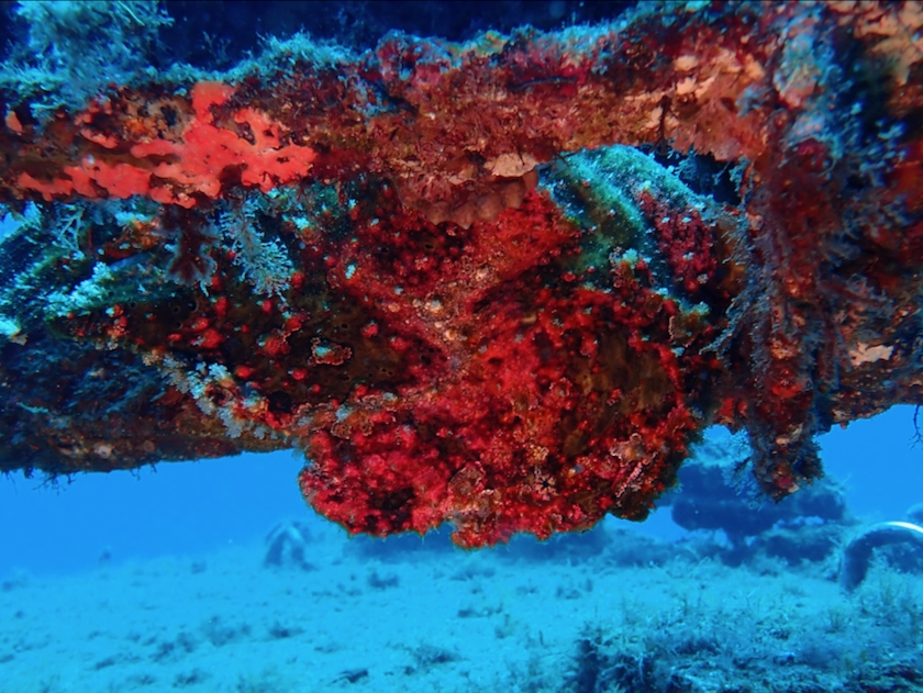 錆びた鉄骨に逆さまにぶら下がっているオオモンカエルアンコウ。