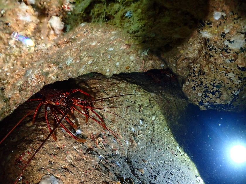 洞窟の奥には、大きなイセエビが何匹もごそごそといました。