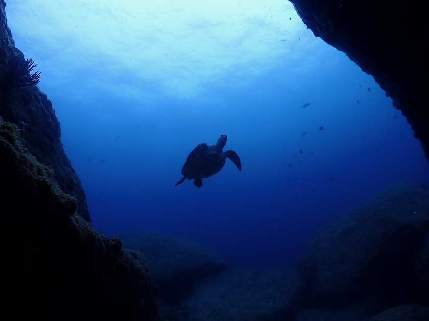洞窟を出たところでアオウミガメに遭遇しました!