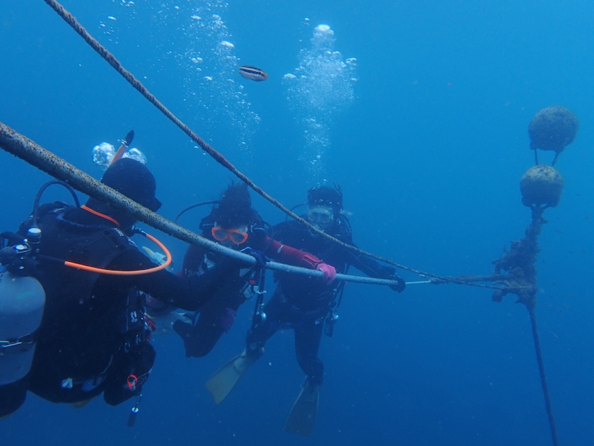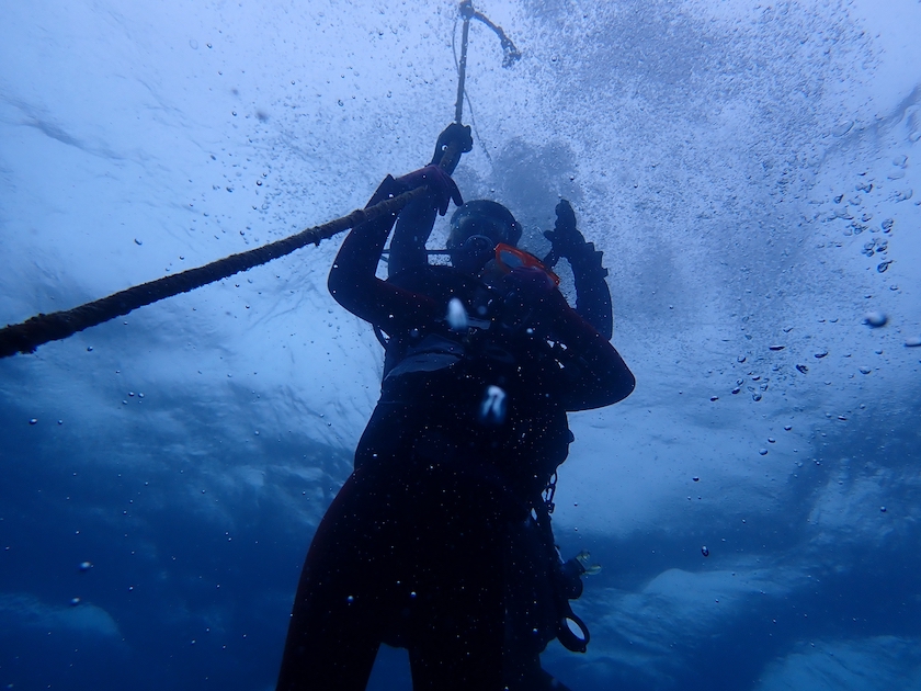 1本目は流れもあって、ビギナーゲストのロープ潜降も苦戦。