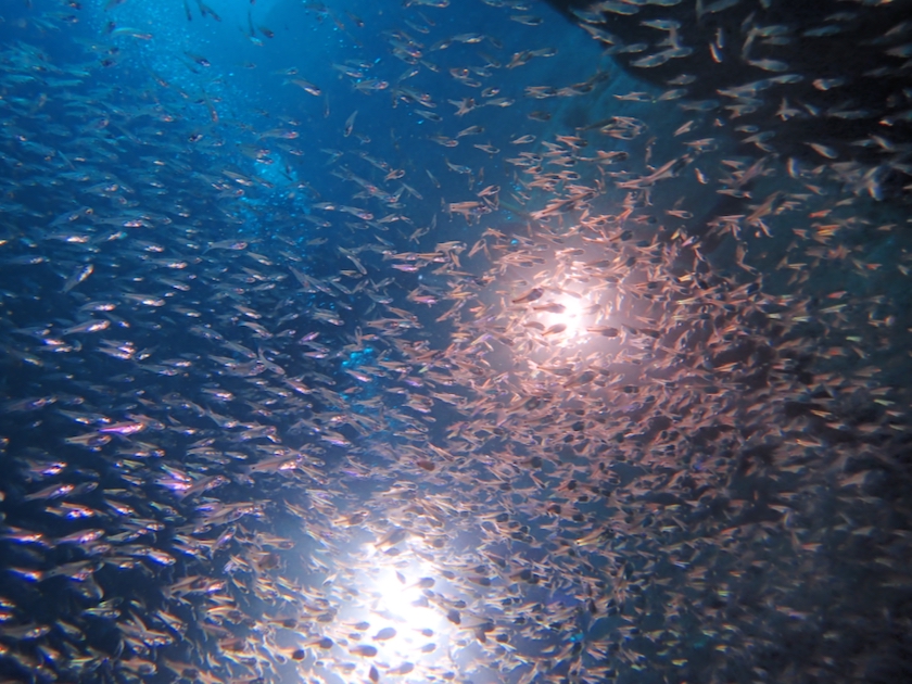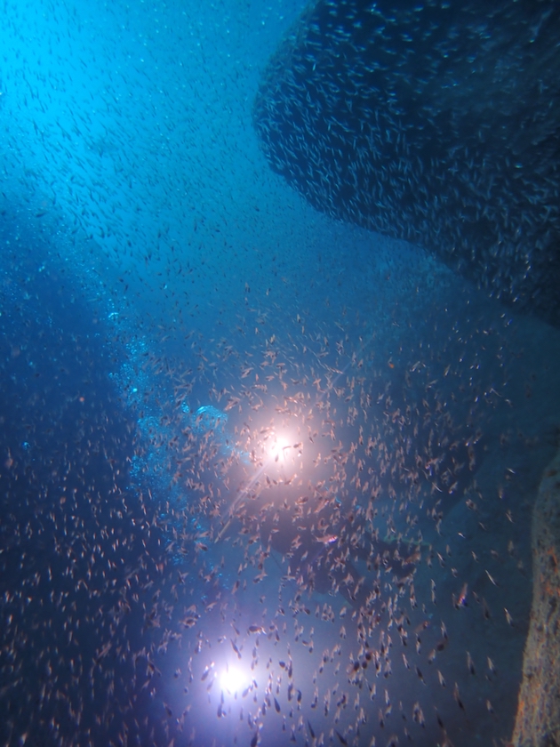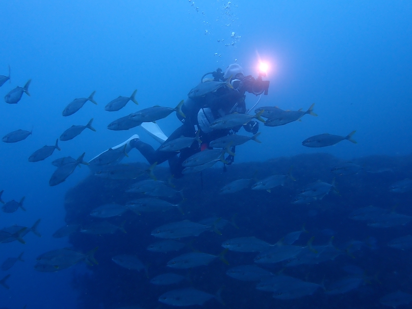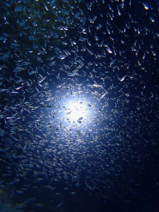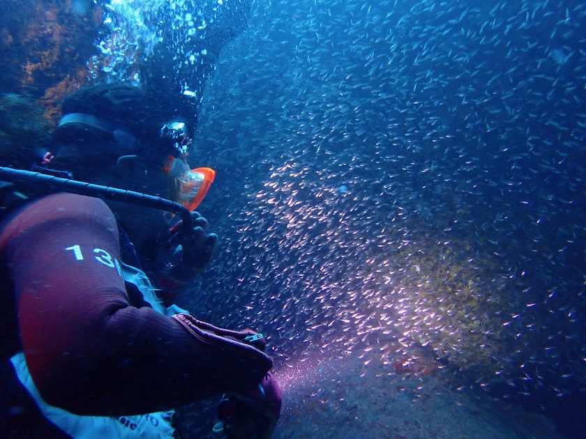 魚群をはさんで互いにライトで照らし合いながら群れを撮る!