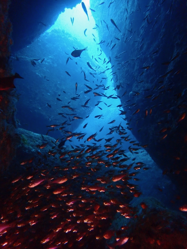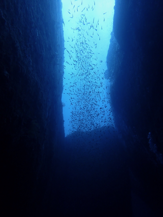 でも奥様は久しぶりでも落ち着いて潜れていたので、後半は少しだけうねりのある水路を通って、Hの穴へ。