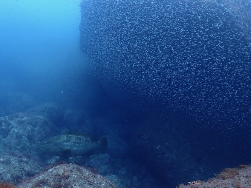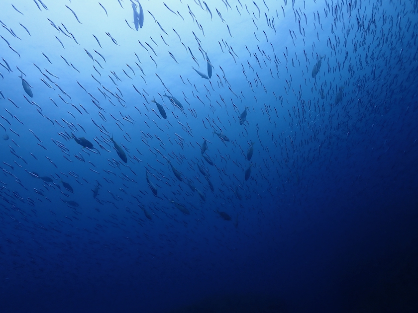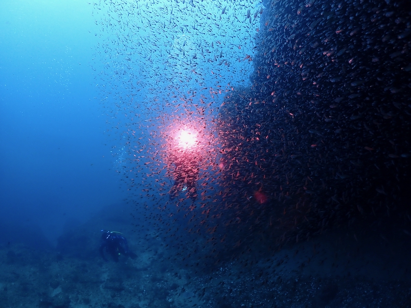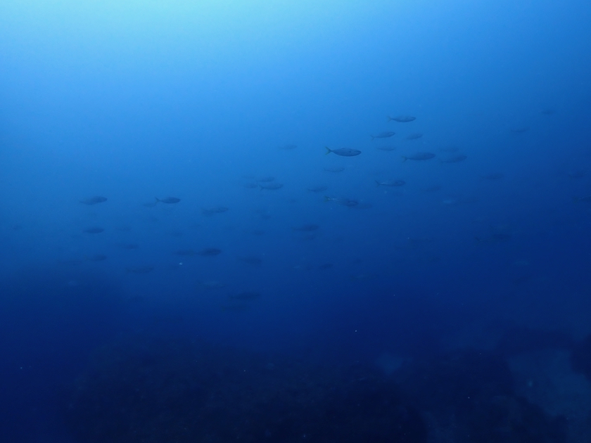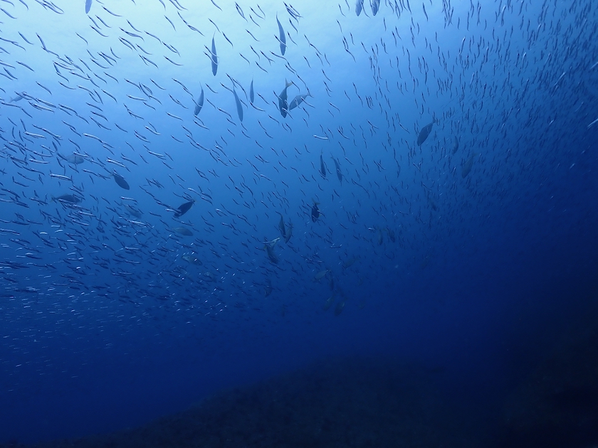 もう潜降してすぐ、黒崎の先端の周辺はキビナゴや今年生まれたらしきクロホシイシモチの幼魚でいっぱいです!