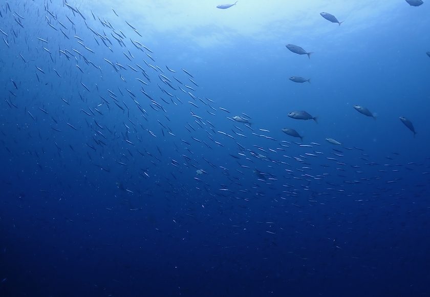 もう潜降してすぐ、黒崎の先端の周辺はキビナゴや今年生まれたらしきクロホシイシモチの幼魚でいっぱいです!