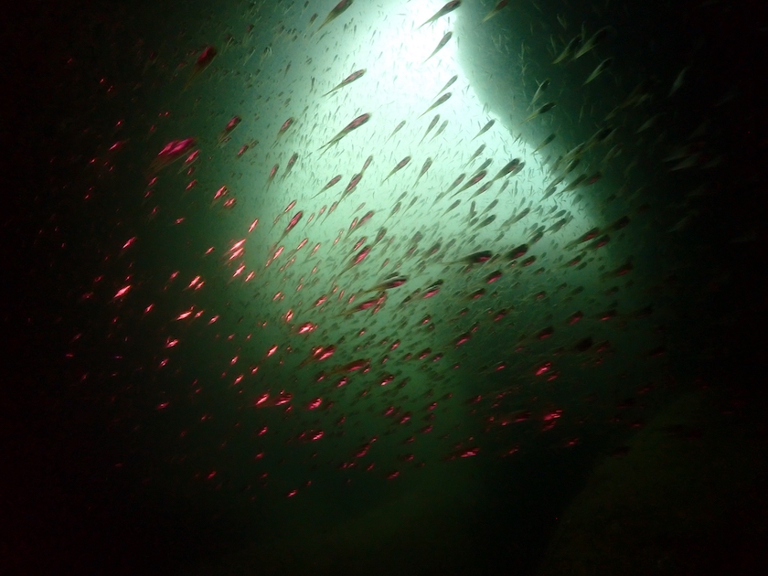 複雑なトンネル内、ほとんど全部に魚が群れています。