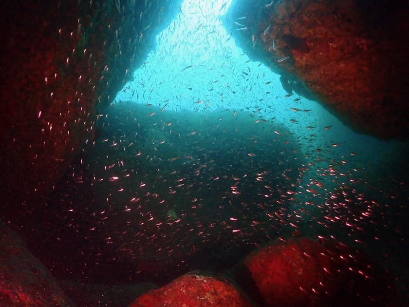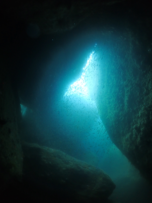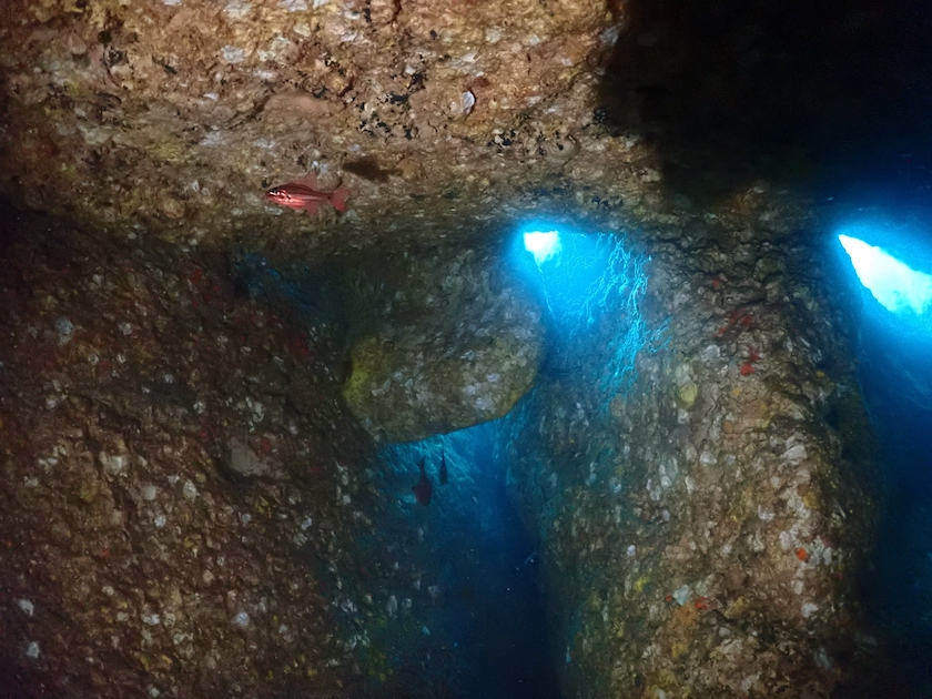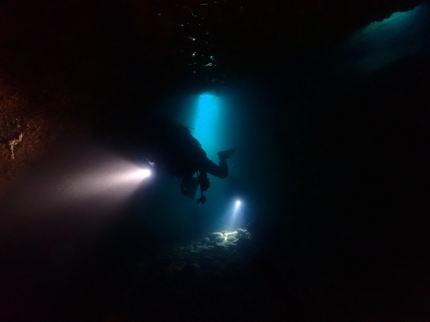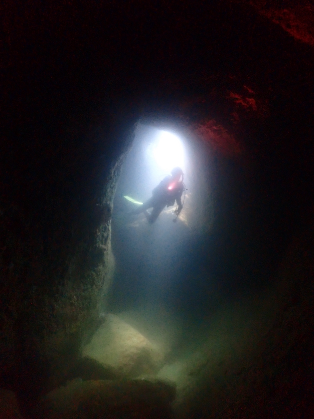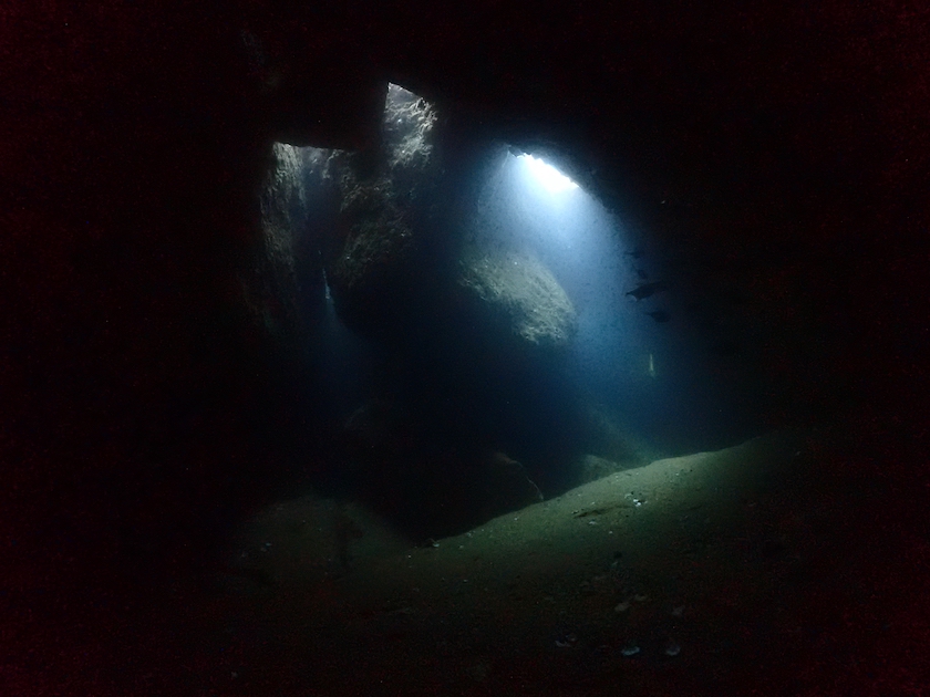 洞窟の突き当たりに、以前は三角穴というダイバーが通り抜けられる穴がありましたが。