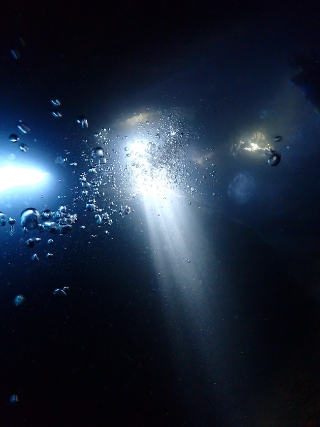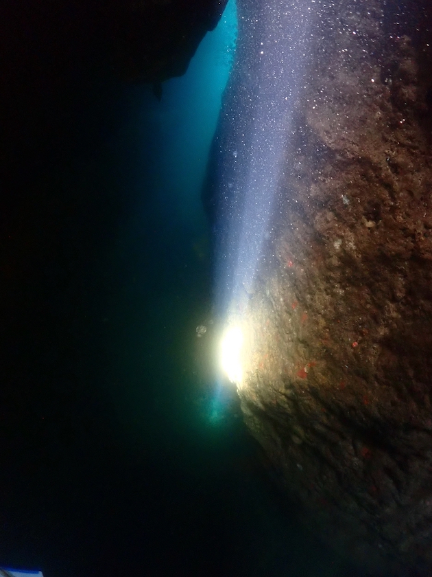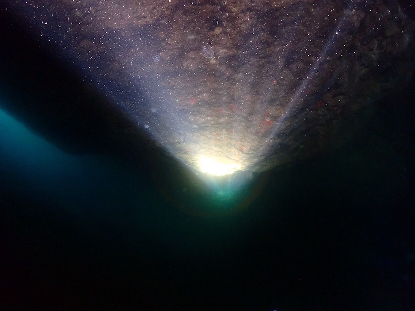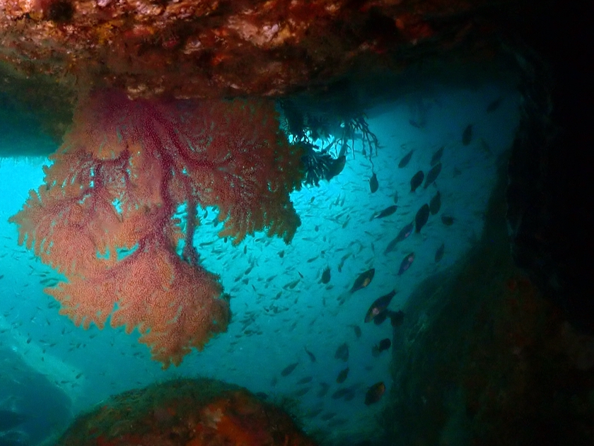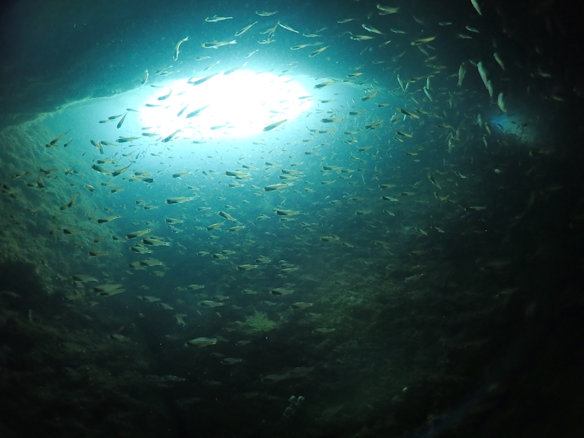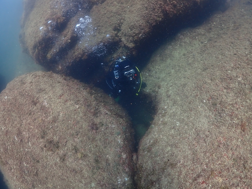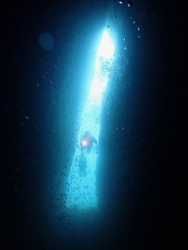 洞窟の突き当たりに、以前は三角穴というダイバーが通り抜けられる穴がありましたが。