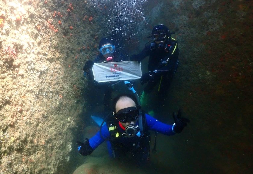 4の穴では、このダイビングで通算100本目を迎えた方のお祝いの記念写真!