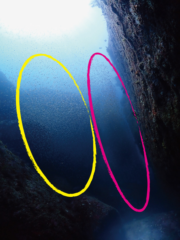 岩と岩の間のピンクの輪っかの中は、魚の群れです!