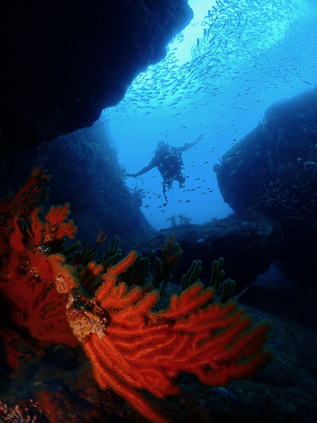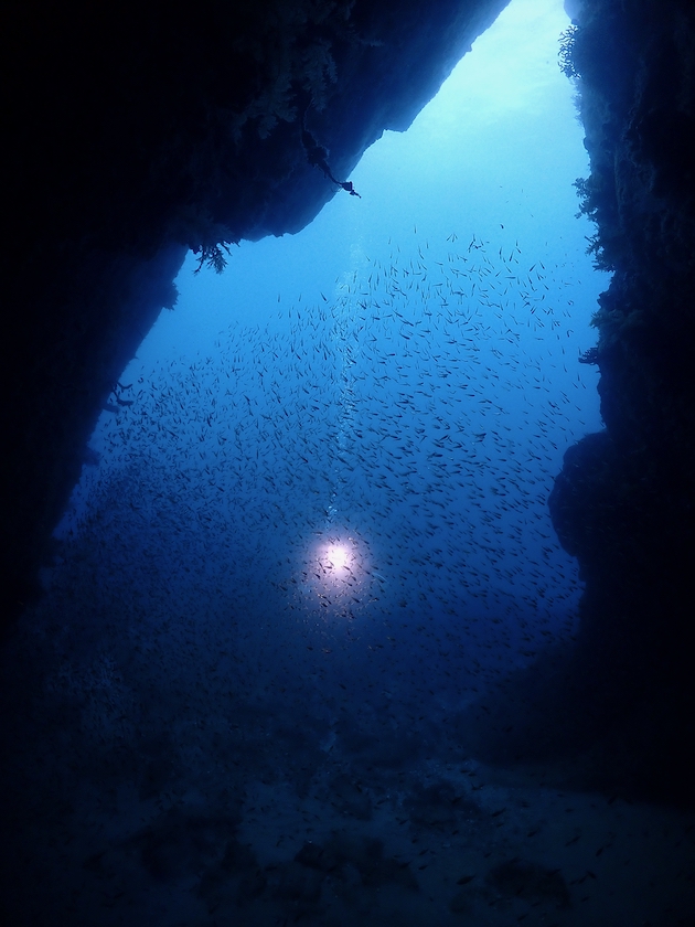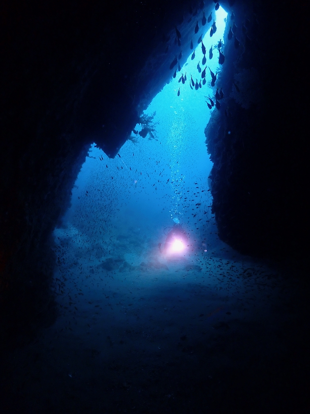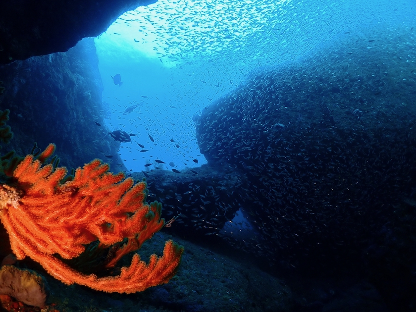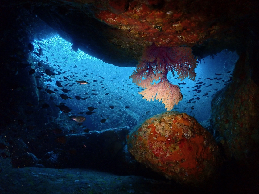Hの穴の左側のトンネルで、色の綺麗なソフトコーラルと地形をからめた写真を撮って。