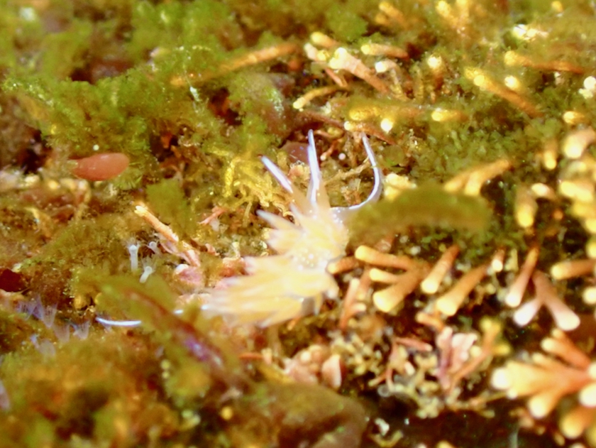 足元にはうねりに揺られる極小のアカエラミノウミウシや。