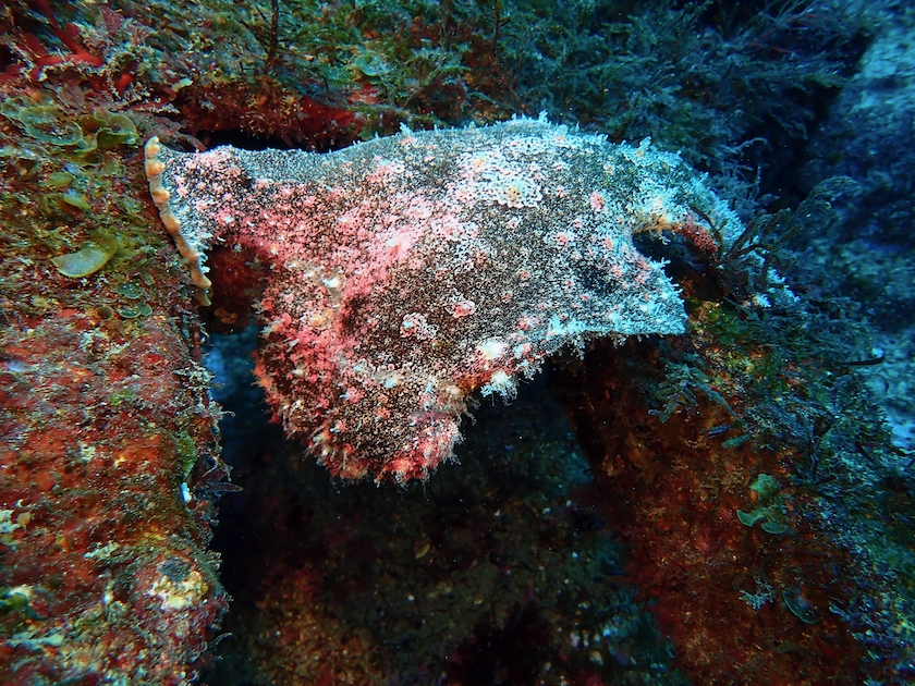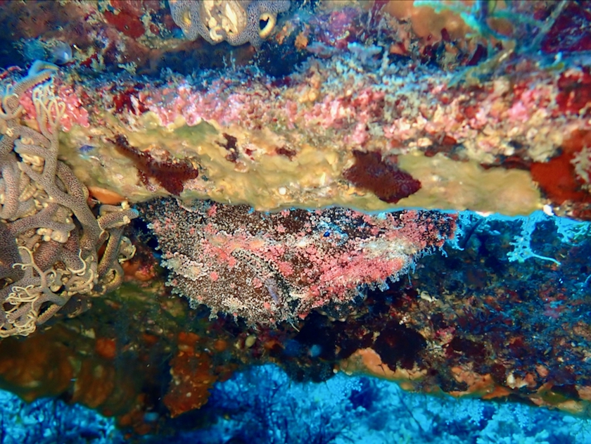 魚礁の残骸の鉄骨から顔だけ出してるオオモンカエルアンコウ。