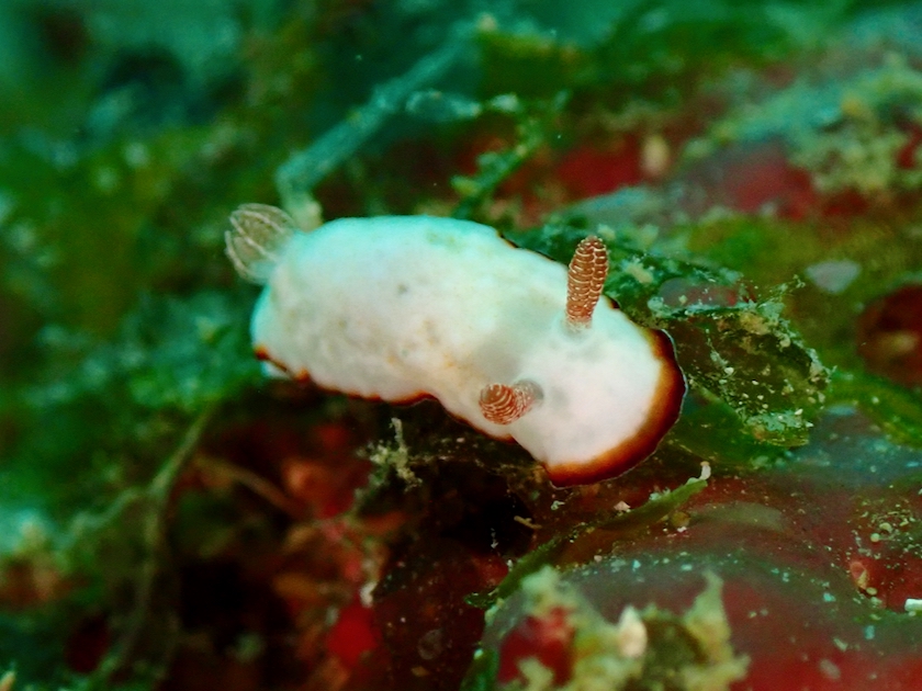 ウチナミシラヒメウミウシにも似ていますが、体地色が白一色ではなく不規則に半透明な部分があるし、縁取りの内側に細い白線もありません。