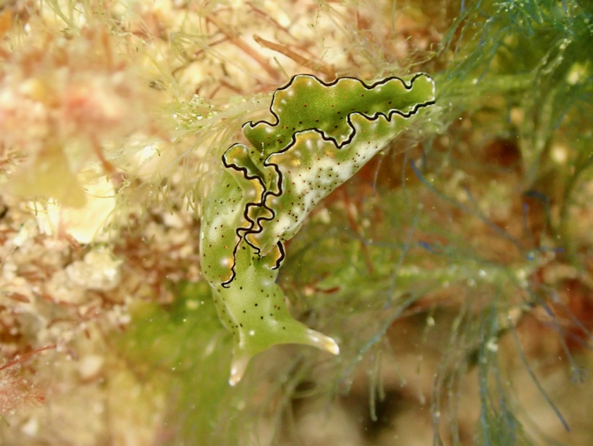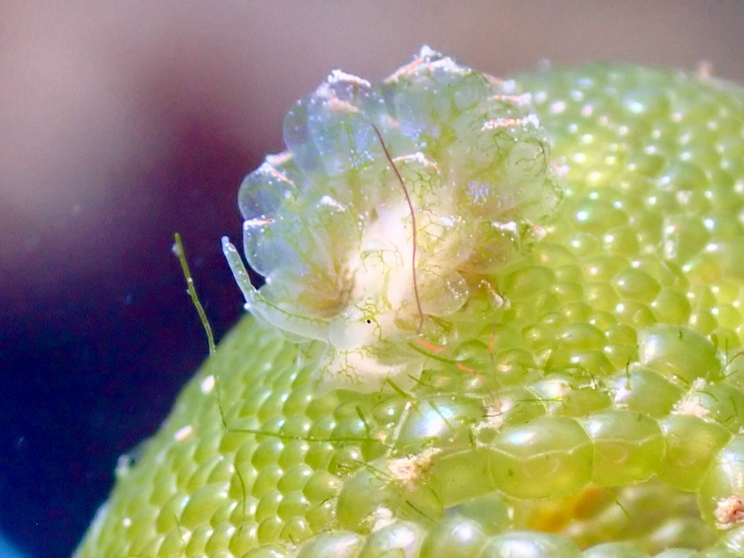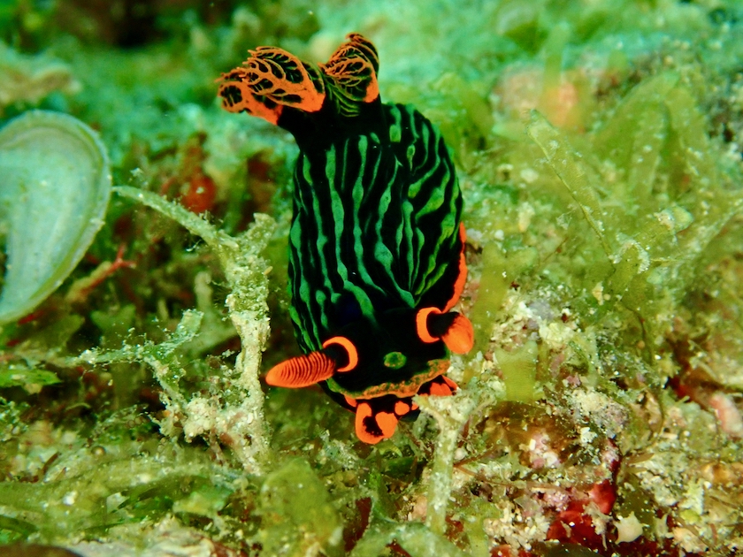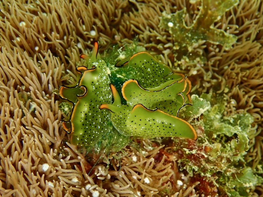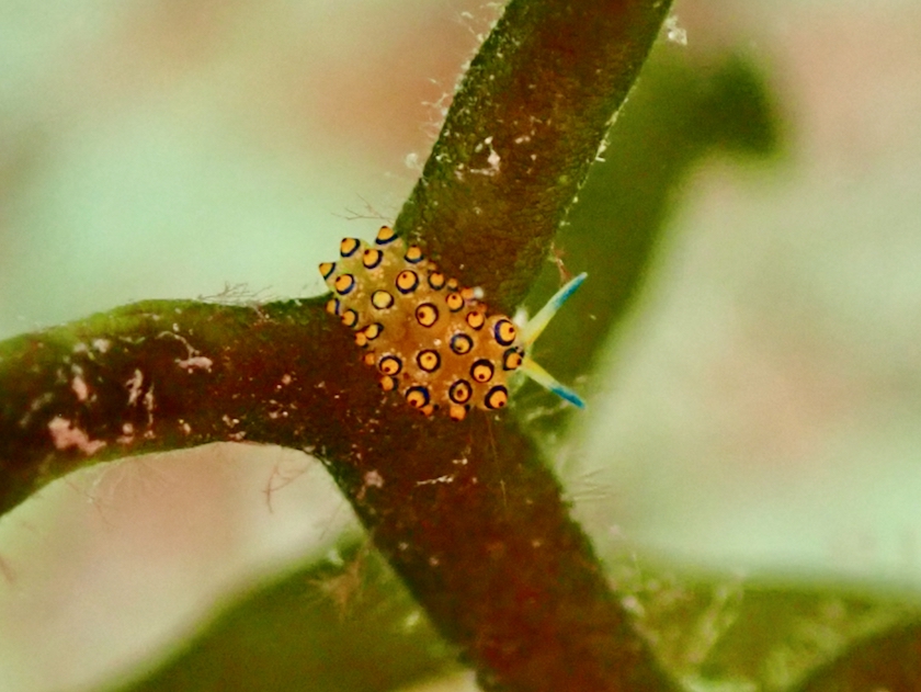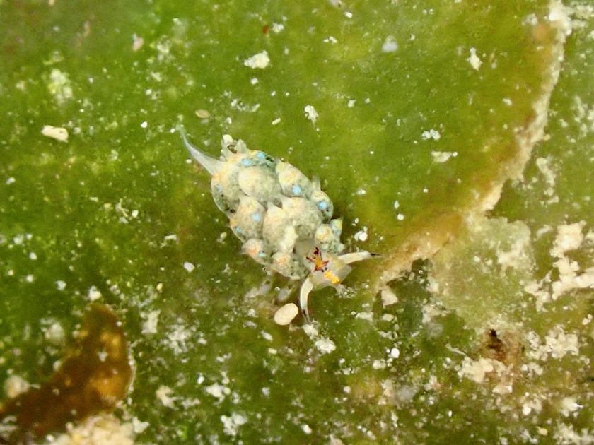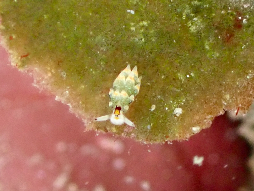 ミノウミウシの仲間に形がよく似ていますが、ガヤではなく緑藻の上にいます。