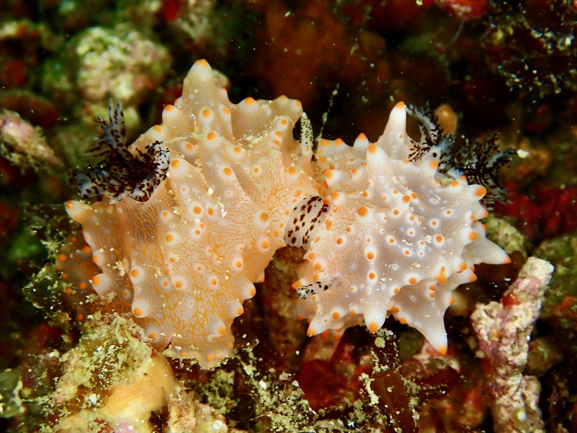 コンペイトウウミウシに似ていますが、細かなオレンジの線が全体に入っている点が違いますね。