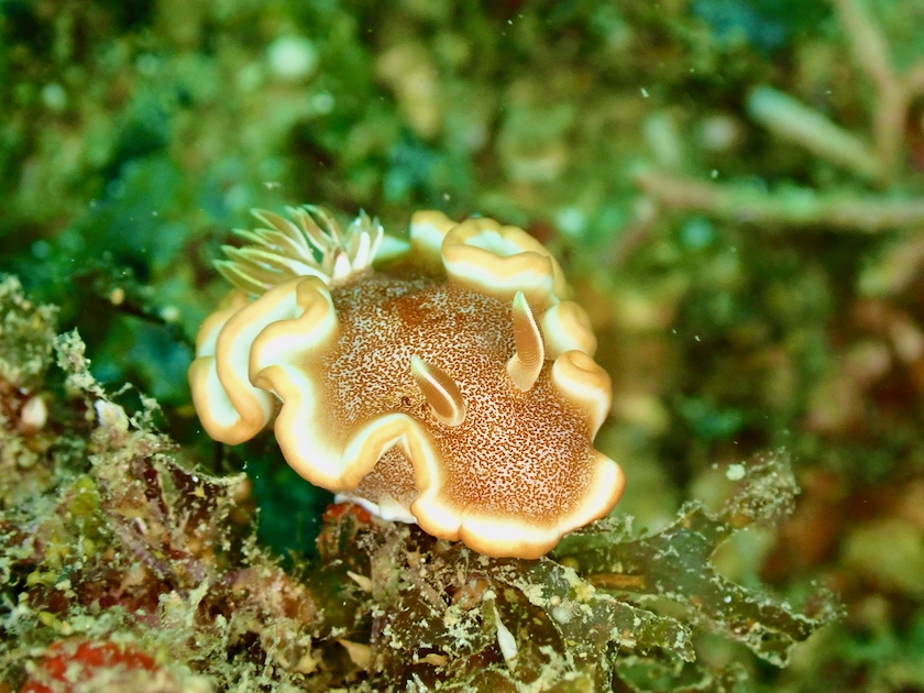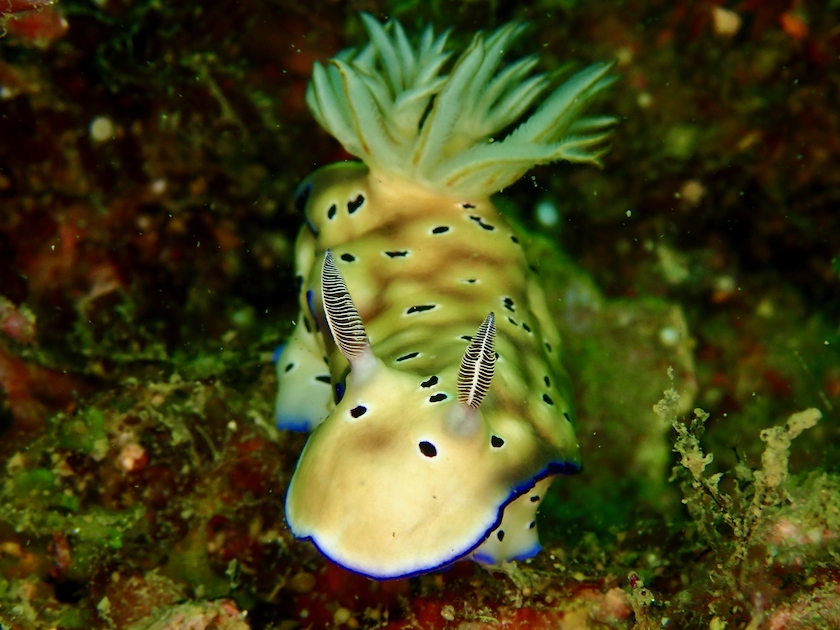 ミナミコモンウミウシに一見すると似ていますが、縁取りは斑紋ではないし色味も違います。