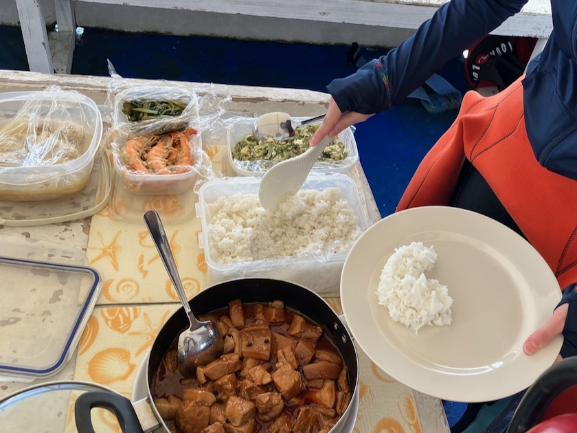 いつもランチはダイビングの合間に、ダイビングサービスが用意してくれるご飯を船の上で食べています。