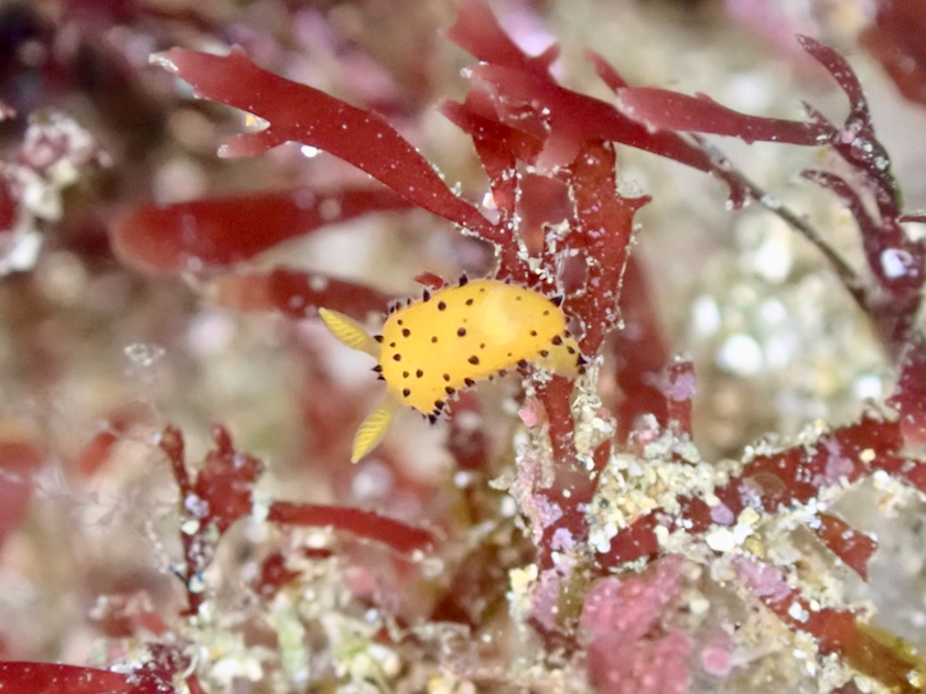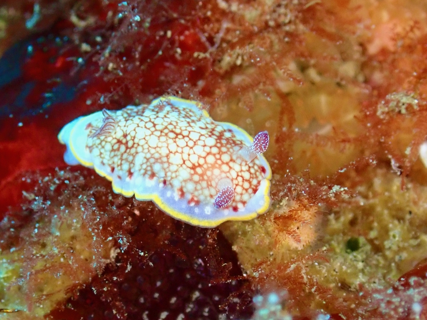紅藻を探すと見つかるヤグルマウミウシ。