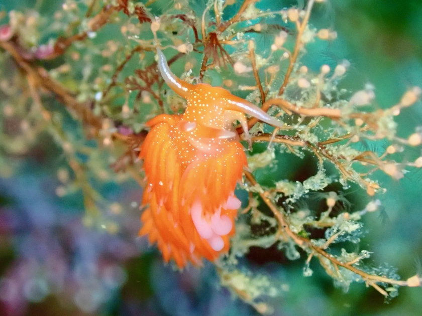 アカエラミノウミウシは、寄生虫のタマゴが付いていました。
